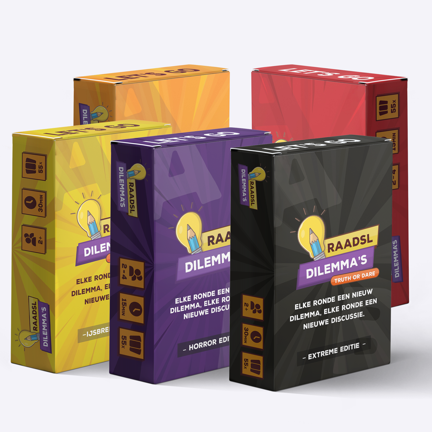 - Dilemma’s edities: 2–4 spelers • ±15 min per ronde • 55 kaarten per editie