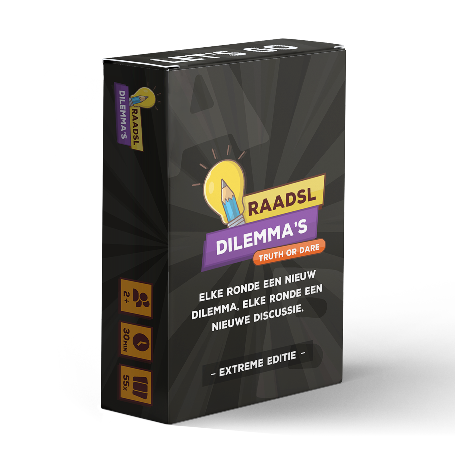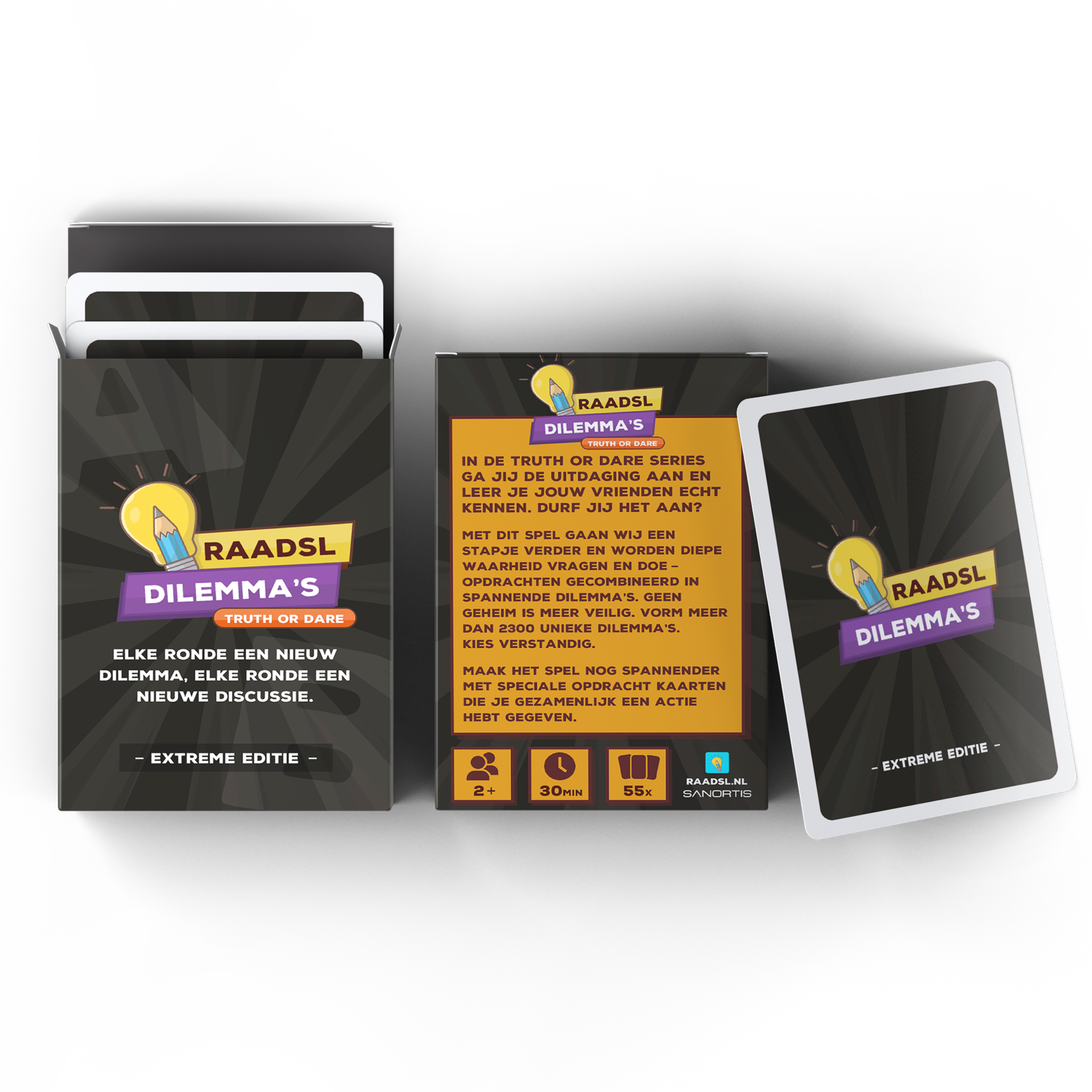 RAADSL Truth or Dare – Extreme Editie is de 18+ variant van het Truth or Dare dilemma kaartspel van RAADSL. Je creëert iedere beurt een dilemma met twee kaarten op A en B en kiest wat je durft. Deze editie is spannender, heftiger en explicieter dan de IJsbreker Editie—perfect voor feestjes, pre-drinks en avonden met vrienden. Ook ideaal om na de IJsbreker Editie door te pakken als iedereen lekker in de flow zit.