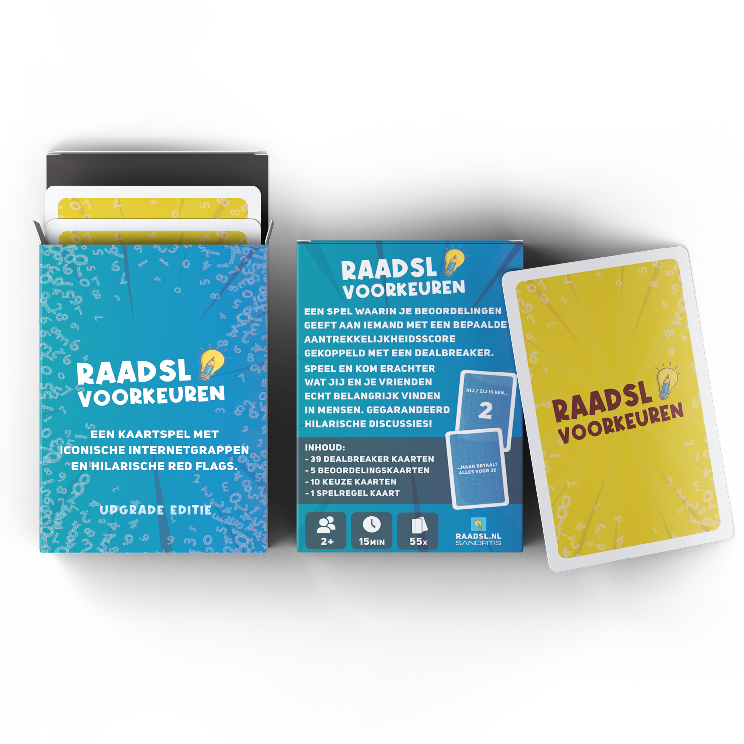 Met de Voorkeuren Duo bundel heb je beide edities van RAADSL Voorkeuren in huis: de Downgrade Editie (“Hij/zij is een 10, maar…”) én de Upgrade Editie (“Hij/zij is een 2, maar…”). Perfect voor feestjes en vriendenavonden: je wisselt makkelijk tussen red flags en green flags. Voordeelbundel: je profiteert van bundelkorting t.o.v. los kopen.
